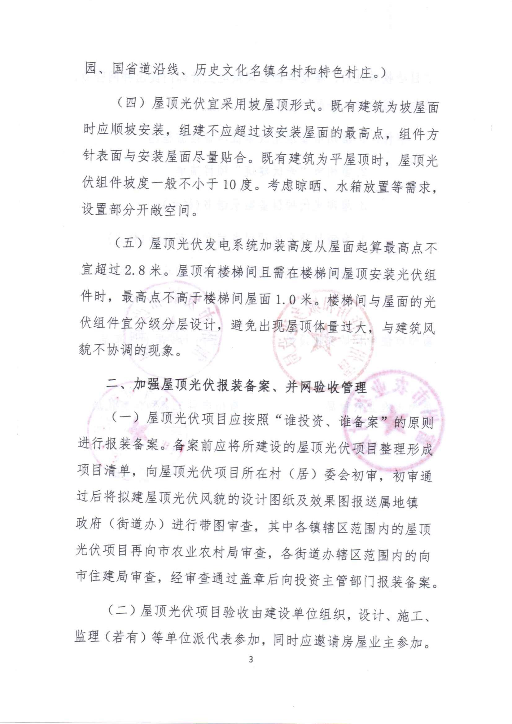 屋頂光伏項目應按照“誰(shuí)投資、誰(shuí)備案”的原則進(jìn)行報裝備案。備案前應將所建設的屋頂光伏項目整理形成項目清單,向屋頂光伏項目所在村(居)委會(huì )初審,初審通過(guò)后將擬建屋頂光伏風(fēng)貌的設計圖紙及效果圖報送屬地鎮政府(街道辦)進(jìn)行帶圖審查,其中各鎮轄區范圍內的屋頂光伏項目再向市農業(yè)農村局審查,各街道辦轄區范圍內的向市住建局審查,經(jīng)審查通過(guò)蓋章后向投資主管部門(mén)報裝備案。